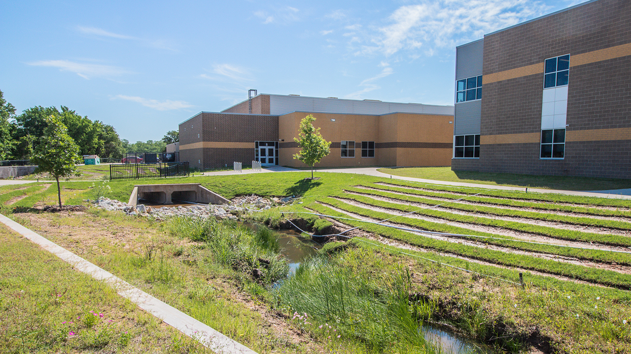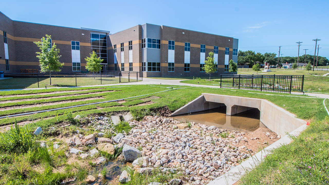 Site, utility, and drainage design for new 82K SF, PK-4th grade campus. Multi-disciplined approach and proactive effort saved Azle ISD over $400K in fees to purchase mitigation bank credits to offset potential impacts of existing on-site stream and avoided months of permitting delays. The preservation of the stream resulted in aesthetically pleasing and interesting site layout and design.