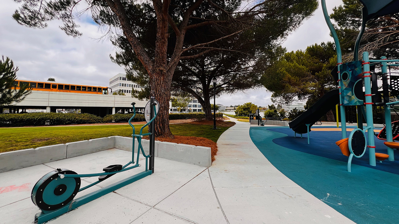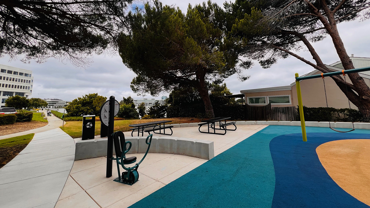 A new park for the Redwood Shores community in Redwood City that provides residents and visitors with improved access to the waterfront trail around the lagoon, outdoor exercise equipment zones, a picnic area, and a new playground.