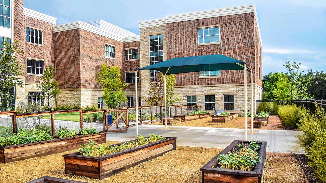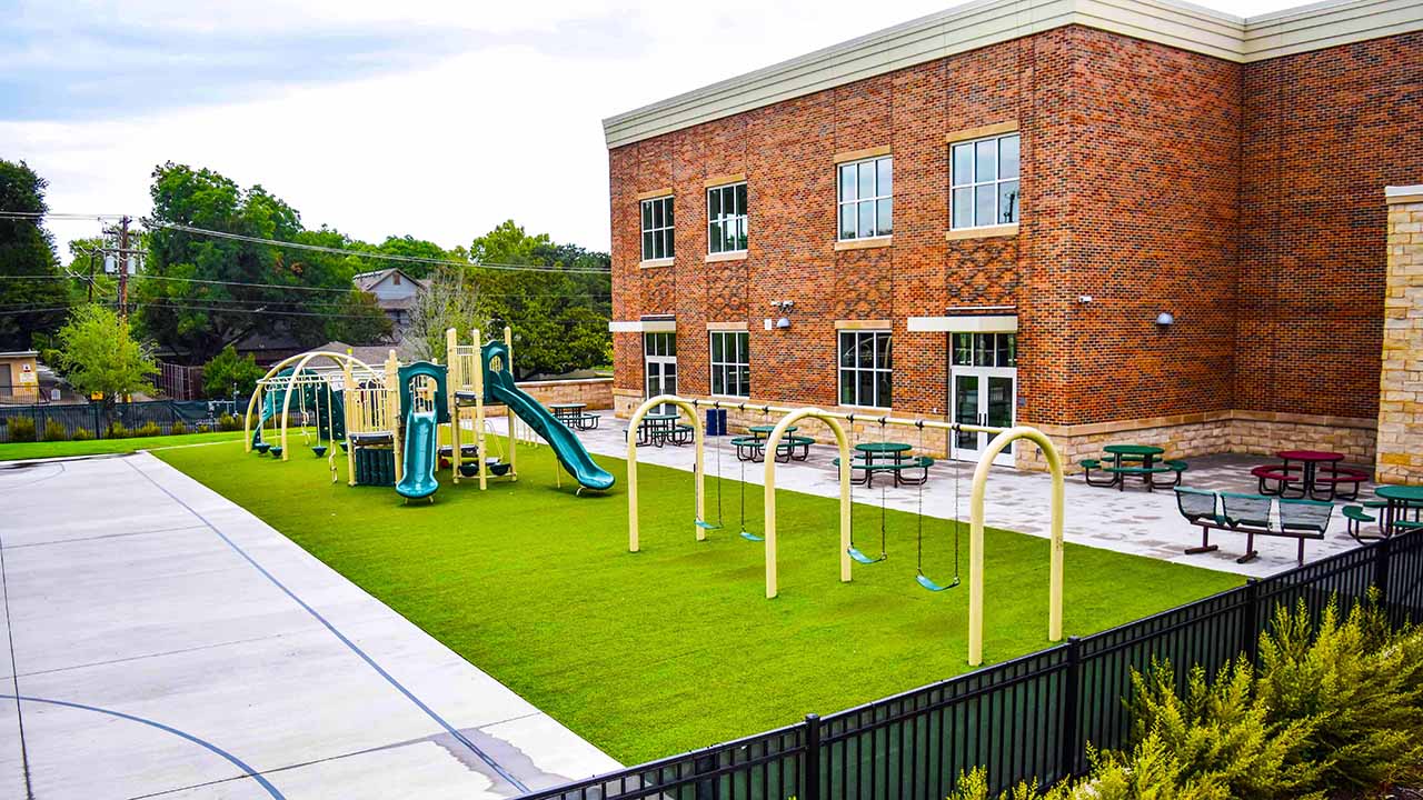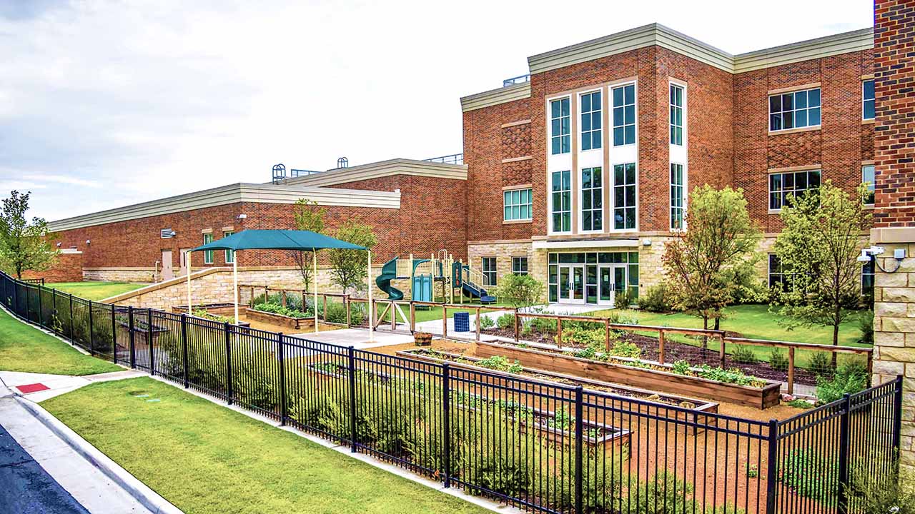 A new and larger school that sits on 4.6 acres with a quarter of the land being used as green space, including a playground, soccer field, an outdoor classroom with a garden, and an outdoor amphitheater.