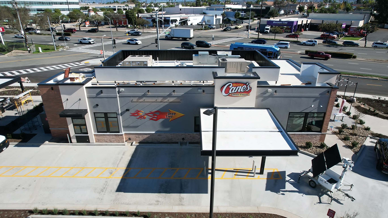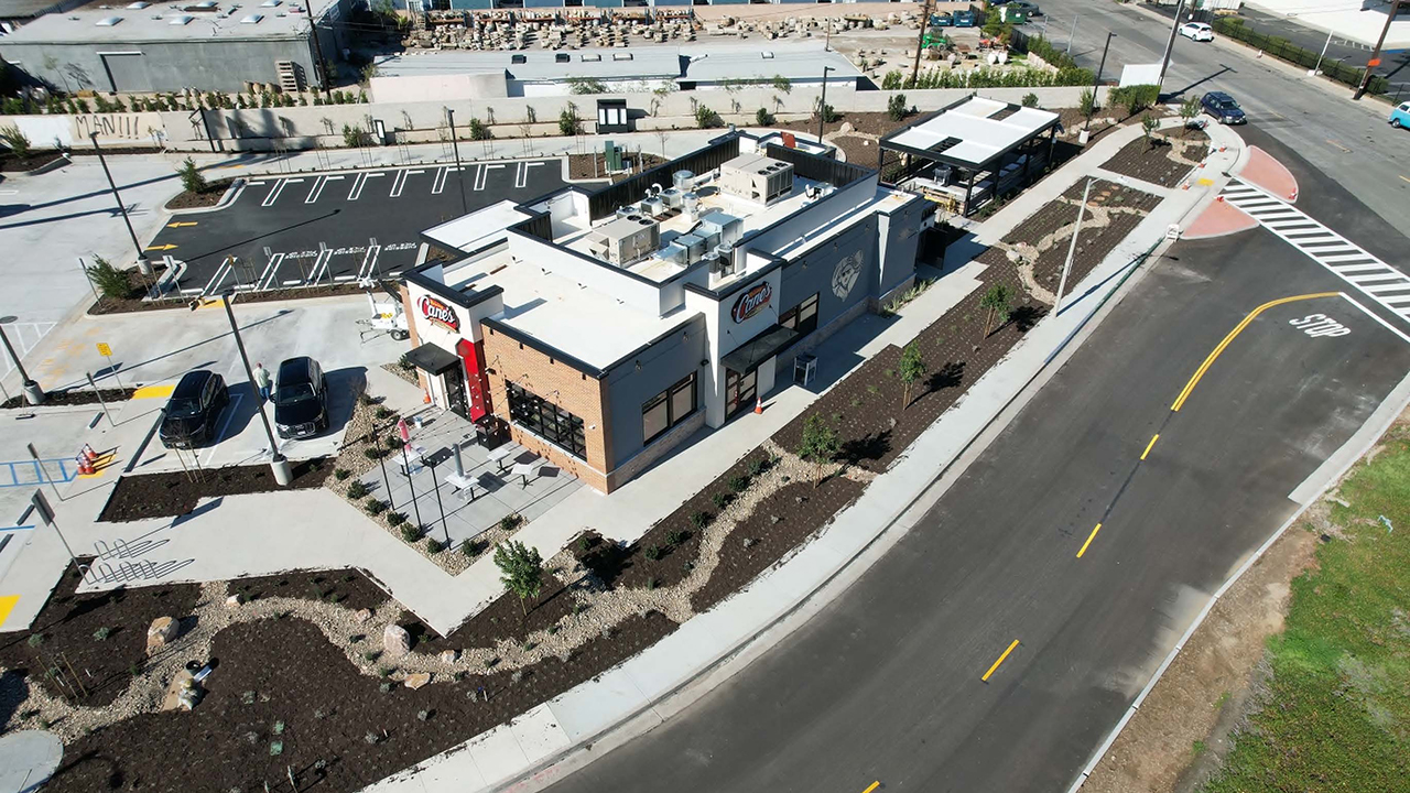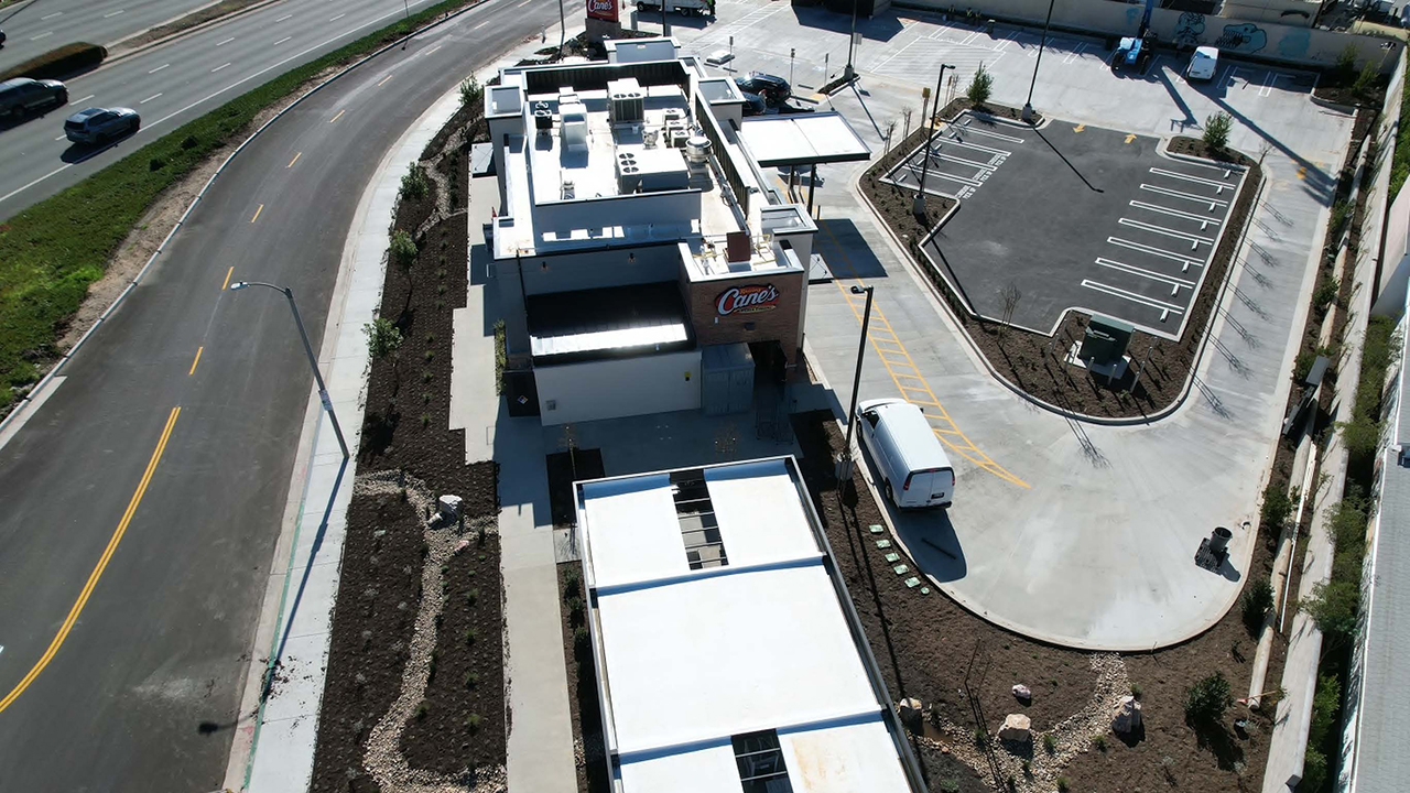 Newly constructed Raising Cane's restaurant, spanning 2,913 square feet, along with a 1,350-square-foot outdoor patio and a dual-lane drive-thru. Site improvements include 34 parking spaces, new site lighting, electric vehicle (EV) chargers, 10 short-term bike lockers, one long-term bike locker, and enhanced landscaping.